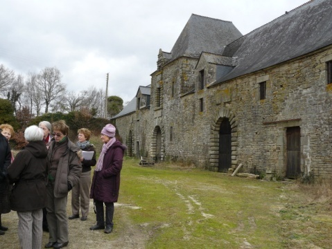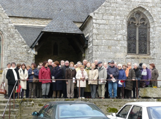 Eglise St Maurice Rattachée à la paroisse de Plumelec, l’église du petit bourg de St Aubin a été édifiée par Jehan de Callac. Une inscription sur une sablière rappelle son droit d’y être inhumé et date le chœur de 1513. La voûte de l’église, en carène renversée présente un ensemble récemment restauré d’entraits, de sablières, de têtes de blochets décorées de motifs végétaux, d’animaux fabuleux ou domestiques, que nous admirons tous. C’est en sortant de l’église que nous posons pour la postérité ! |
